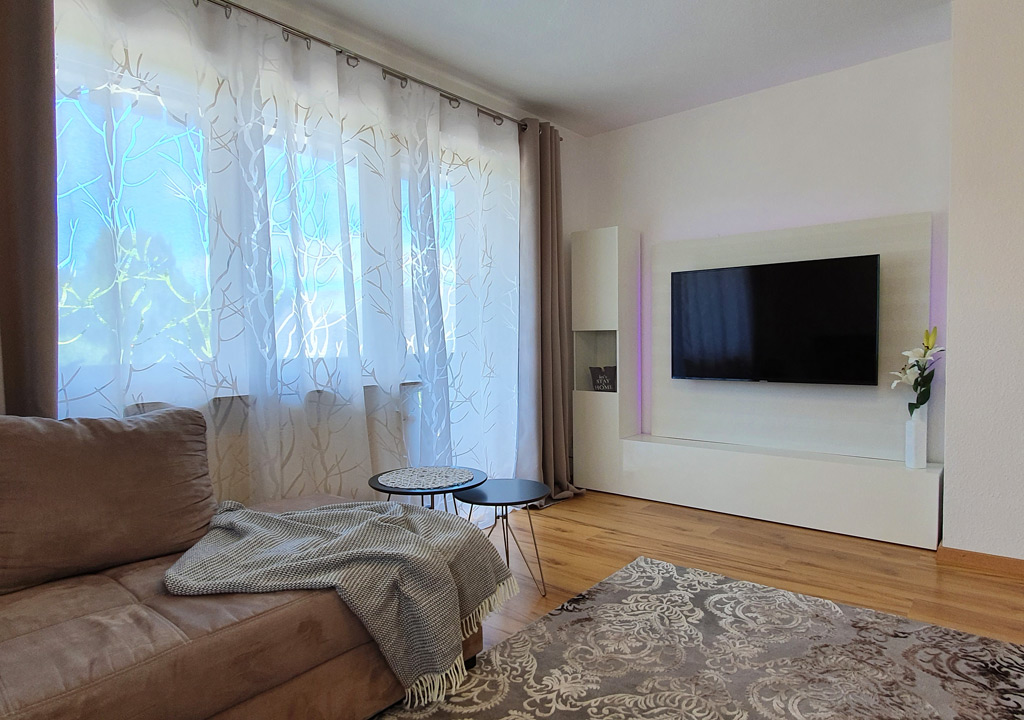 Die liebevoll eingerichtete Wohnung bietet gratis WLAN, ein Schlafzimmer mit Boxspring-Doppelbett, ein Wohnzimmer mit einer gemütlichen Schlafcouch und 4K Smart TV mit Netflix, Amazon Prime Video Ready, eine voll ausgestattete Küche mit Kühlgefrierkombi, ein komfortables Tageslichtbad mit Badewanne und Dusche und einem Waschtrockner (für kleines Geld), sowie ein separates Gäste-WC.